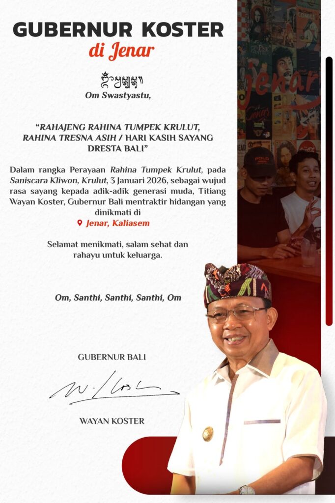 Peringatan Rahina Tumpek Krulut, Gubernur Bali Wayan Koster berbagi kasih dan dimaknai sebagai Rahina Tresna Asih atau Hari Kasih Sayang menurut Dresta Bali pada Saniscara Kliwon, Krulut, Sabtu (3/1/2026). Koster mentraktir hidangan makanan dan minuman khas Bali yang bisa dinikmati di tiga lokasi usaha lokal Bali. Adapun lokasinya meliputi: Jenar, Kaliasem; Tan-Panama Coffee, Jalan Veteran; […]