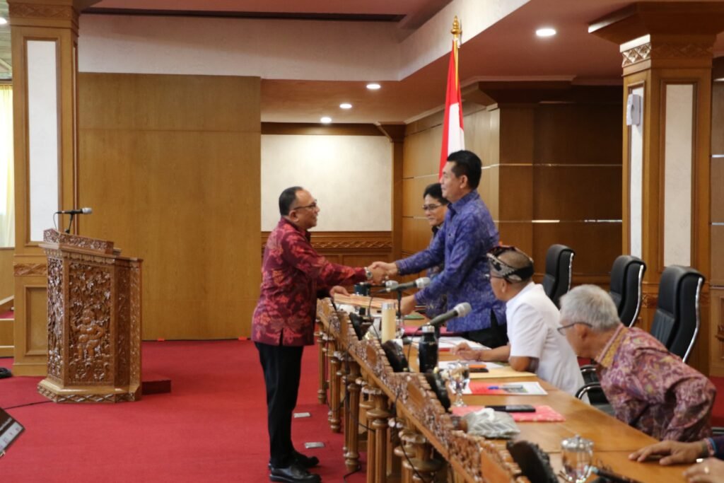 Ket Foto Ist: Usai bacakan catatan rekomendasi LKPJ, Koordinator Pembahasan LKPJ Kepala Daerah Provinsi Bali Tahun 2025, Gede Kusuma Putra, bersalaman dengan Ketua DPRD Bali Dewa Made Mahayadnya, pada paripurna Ke-35, Jumat (24/4/2026).