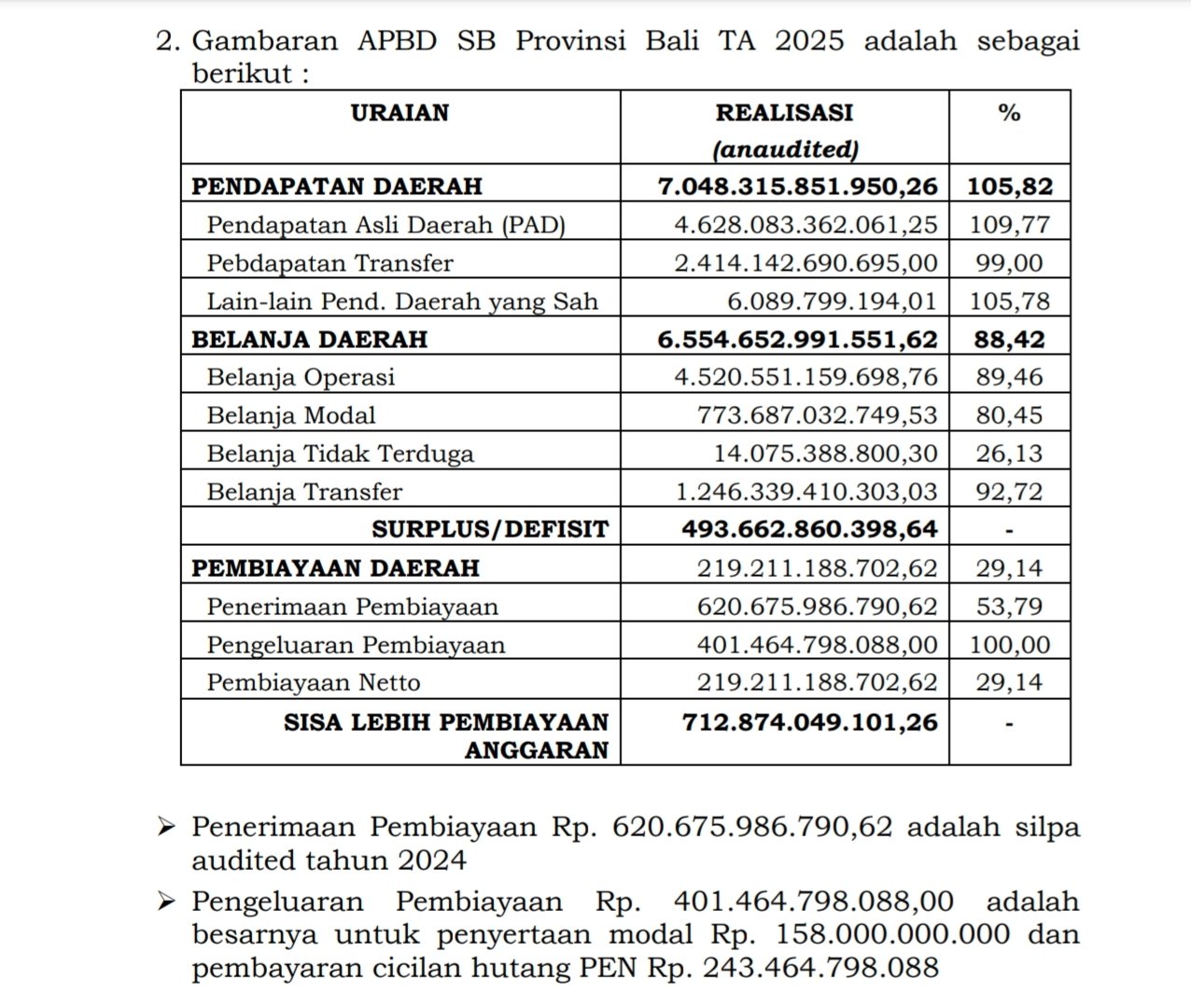 Kusuma Putra menjelaskan Penerimaan Pembiayaan Rp620.675.986.790,62 adalah silpa audited tahun 2024. Kemudian, Pengeluaran Pembiayaan Rp401.464.798.088,00 adalah besarnya untuk penyertaan modal Rp158.000.000.000 dan pembayaran cicilan hutang PEN Rp243.464.798.088.