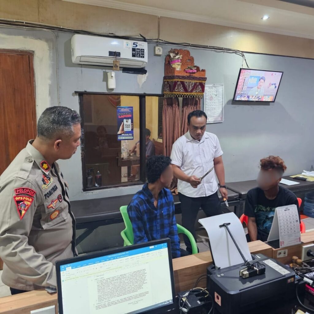 Diduga membawa senjata tajam (sajam) dan mengonsumsi minuman keras di area sebelah barat Monumen Bajra Sandhi, Desa Sumerta Kelod, Denpasar Timur, Dua pria akhirnya diamankan Polsek Dentim, Minggu (08/02/2026) Pukul 17.00 Wita.