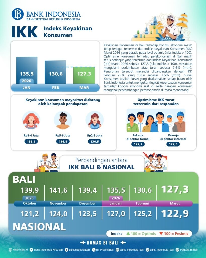 Indeks Keyakinan Konsumen (IKK) Maret 2026 sebesar 127,3 (nilai indeks > 100) menunjukkan bahwa optimisme konsumen terhadap perekonomian di Bali, masih terus berlanjut.