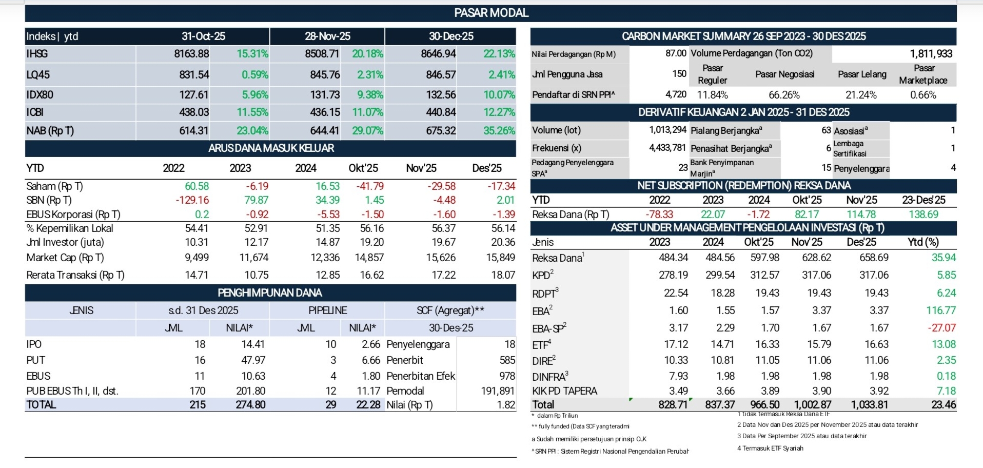 Sejalan dengan terjaganya kinerja perekonomian nasional dan sentimen positif di pasar keuangan global, pasar modal Indonesia menutup tahun 2025 dengan kinerja yang baik.