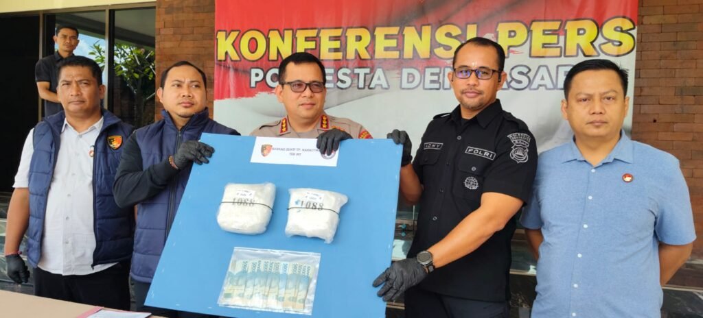 “Diamankan barang bukti berupa dua paket kristal bening diduga mengandung narkotika berat bersih total 2008,2 gram (2 Kg) atau berat kotor total 2040 gram,” ujar Kapolresta Denpasar Kombes Pol. Leonardo D. Simatupang, S.IK., MH., di dampingi Kasat Resnarkoba Polresta Denpasar Kompol I Komang Agus Dharmayana W, S.IK., M.Si., Selasa (11/4/2026).