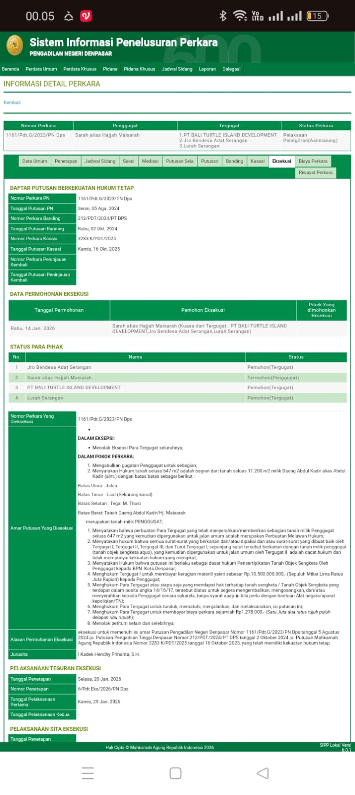 Data permohonan eksekusi, pada Rabu 14 Januari 2026 dengan pemohon eksekusi Sarah alias Hajjah Maisarah (Kuasa dari tergugat: PT Bali Turtle Island Development, Jro Bendesa Serangan, Lurah Serangan).