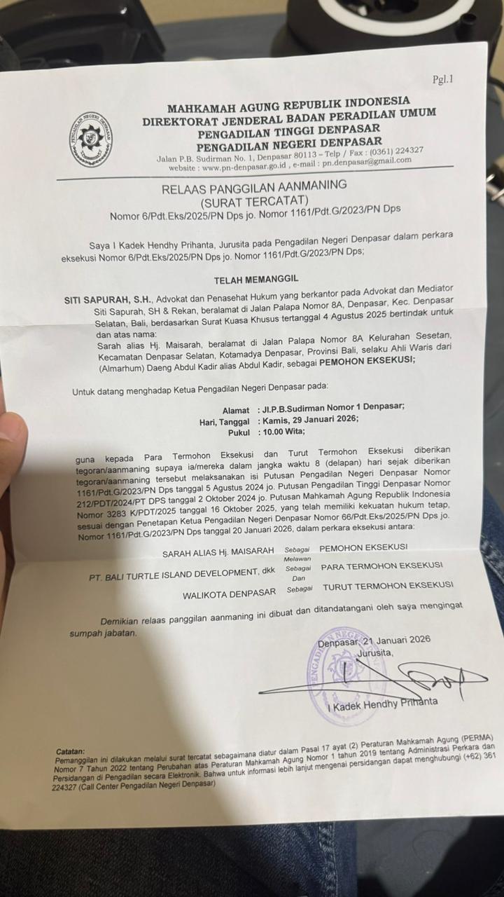“Sarah alias Hj. Maisarah sebagai pemohon eksekusi, melawan PT Bali Turtle Island Development dkk sebagai para termohon eksekusi, dan Walikota Denpasar sebagai turut termohon eksekusi. Tertuang tanda tangan dari Juru Sita, I Kadek Hendhy Prihanta,” ungkap advokat Ipung, pada Senin (26/1/2026).