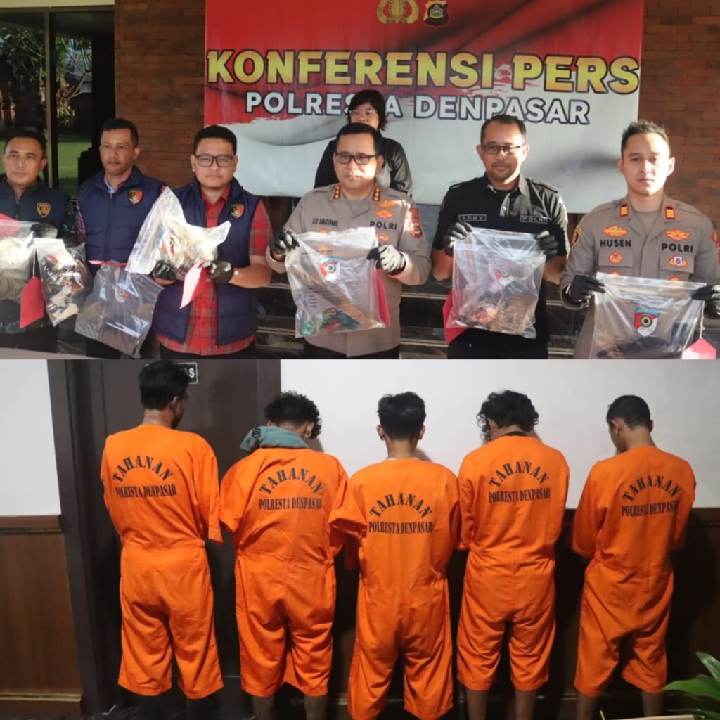 Ket Foto: Lima pelaku penganiayaan di Jalan Pelabuhan Benoa, inisial SA, DH, NU, DR dan IS terhadap korban Egi Ramadan (30) asal Jawa Barat dan Hisam Adnan (30) asal Jawa Tengah, diringkus aparat gabungan Unit Reskrim Polsek Kawasan Pelabuhan Benoa dibackup Jatanras Polda Bali dan Satreskrim Polresta Denpasar, Jumat (10/4/2026).